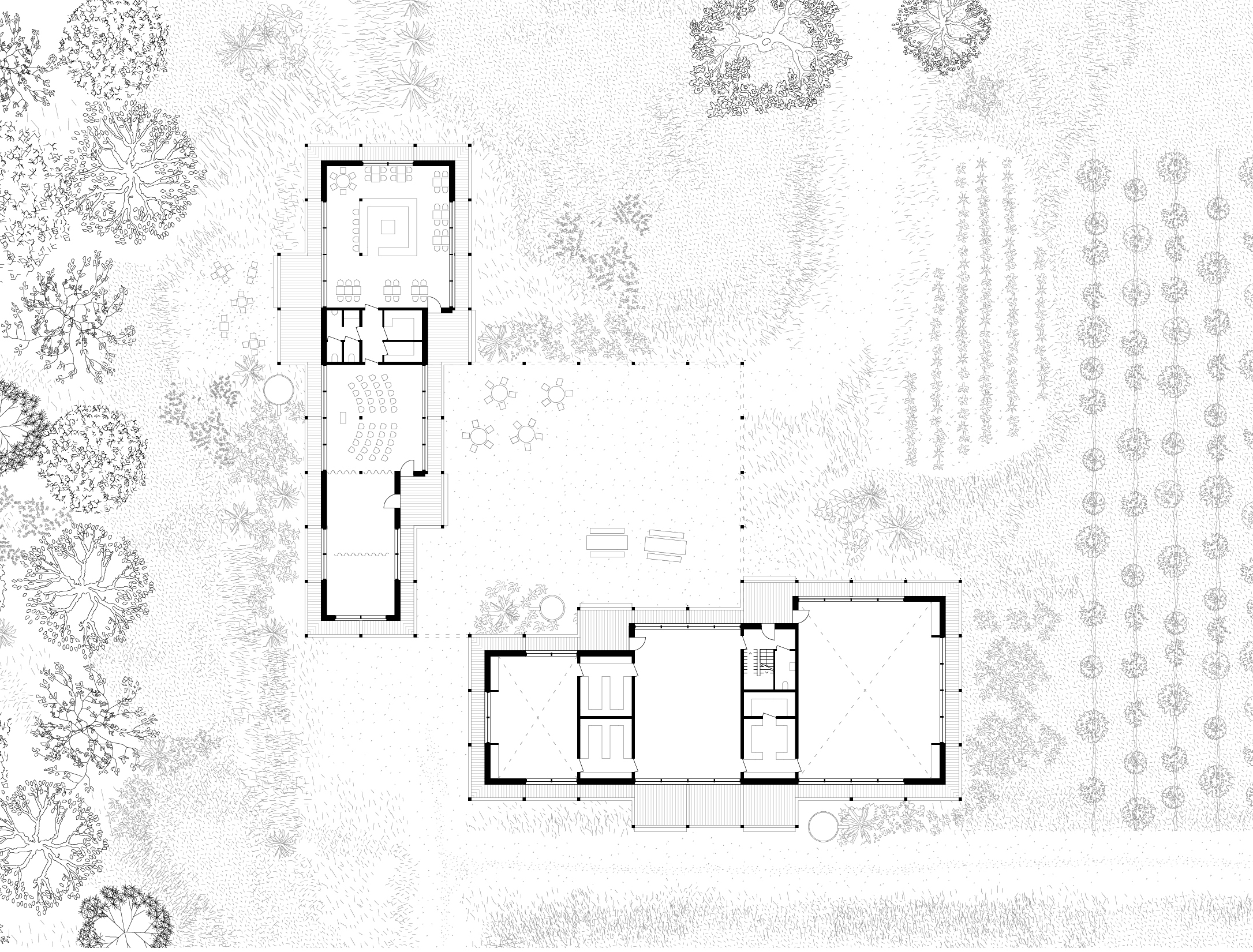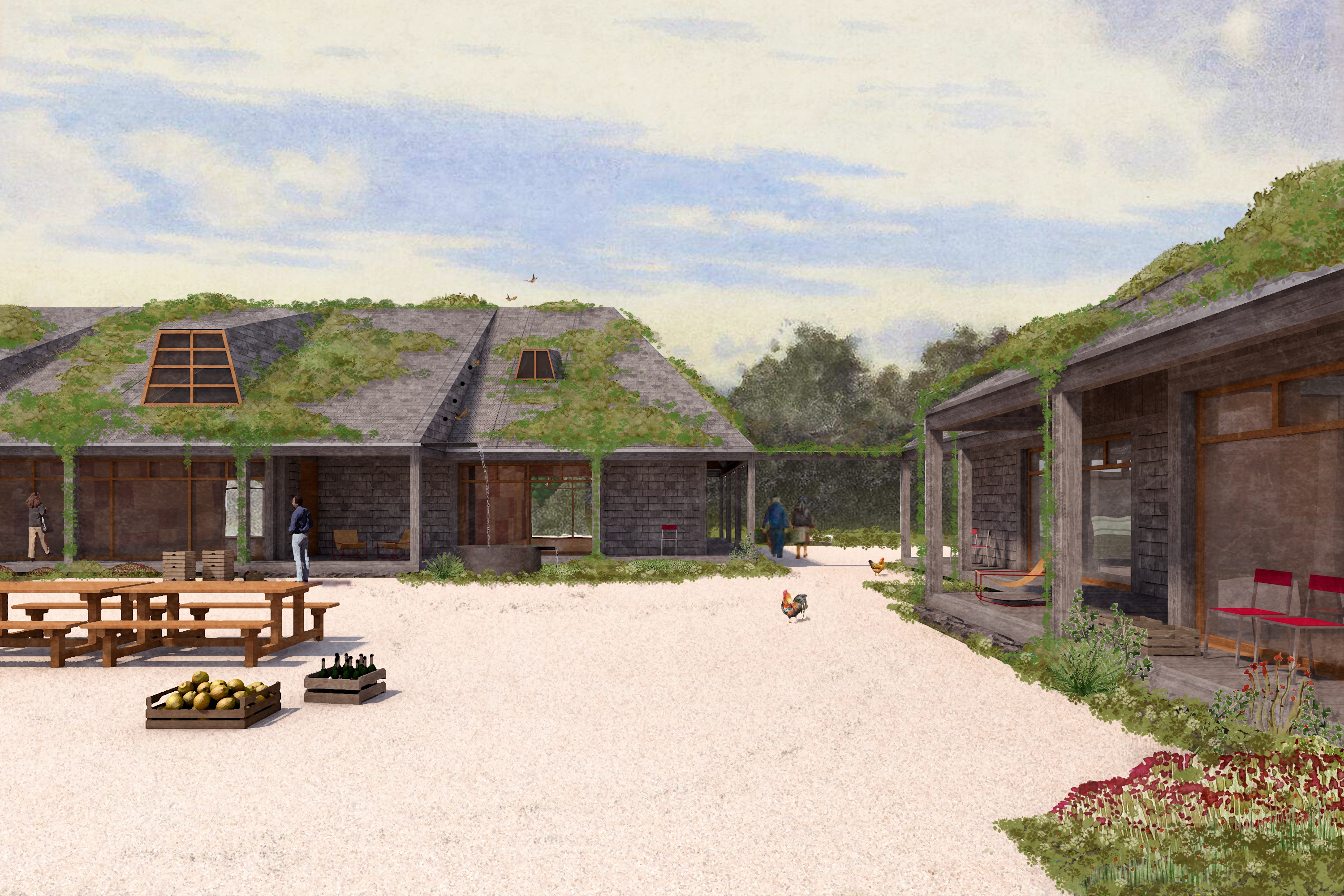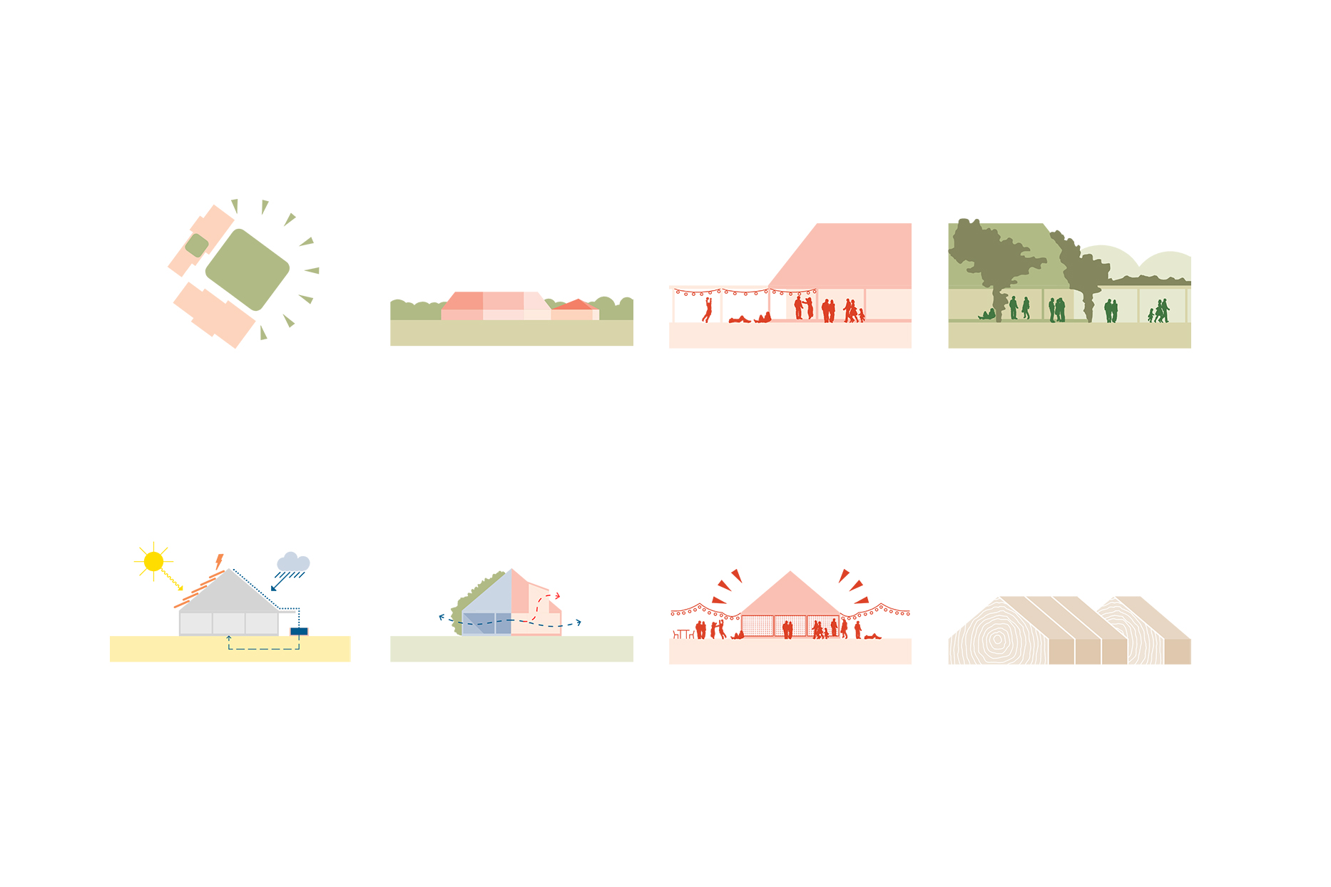 The buildings are conceived as timber-frames insulated with straw bales and are designed to minimise technical installations for heating, cooling and ventilating, staying naturally tempered.